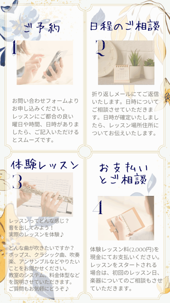 ・持ち物:フルート、筆記用具、お使いの教本や曲集(あれば)